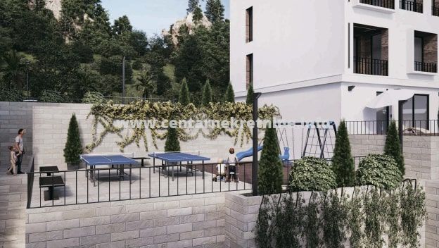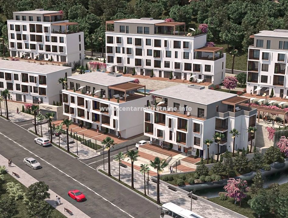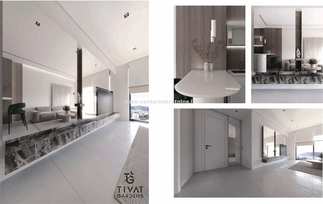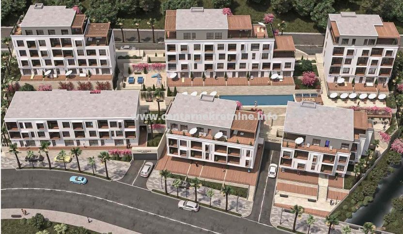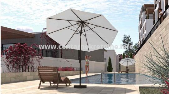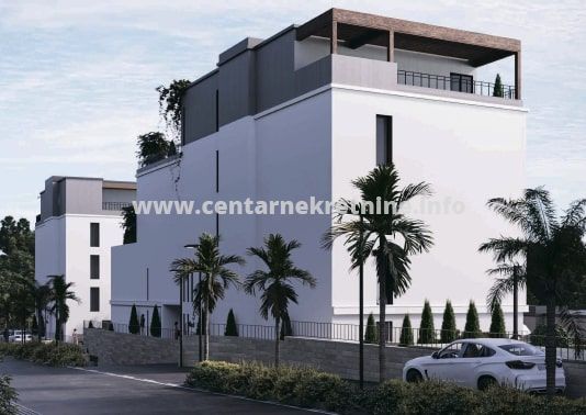 For sale, penthouse apartments in a complex under construction in Tivat, not far from Porto Montenegro, 20 minute walk away from Pine. The complex has 5.500m2 of infrastructure that includes a parking lot, gym, sauna, SPA, heated swimming pool of 21m, mini-cinema, a restaurant/cafe, barbecue space with pergolas, 24h concierge service, video surveillance and security system. All residential units will be fully furnished, equipped with all neccessary household appliances, the highest quality plumbing and installations, with a Smart Home system and WindFree Samsung air conditioning. The front door will have a combination lock for card/key/fingerprint, high-speed internet connection is secured, as well as storage space.