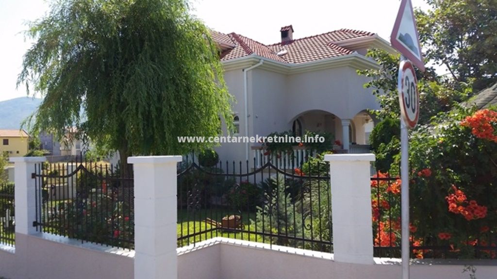 Prodaje se lijepa, prostrana kuca u Zagoricu, sa uređenim dvoristem, povrsine 420m2, na placu od 1.000m2. Kuca se sastoji od suterena, prizemlja i sprata. U suterenu se nalazi garaza za 5 automobila, na prizemlju je dnevni boravak sa kuhinjom i trpezarijom, spavaca soba, kupatilo, toalet i terasa, dok se na spratu nalazi jos jedan dnevni boravak, 4 spavace sobe, kupatilo i terasa.