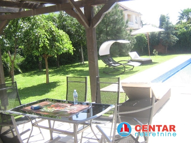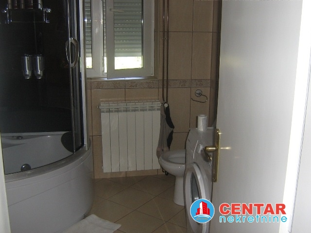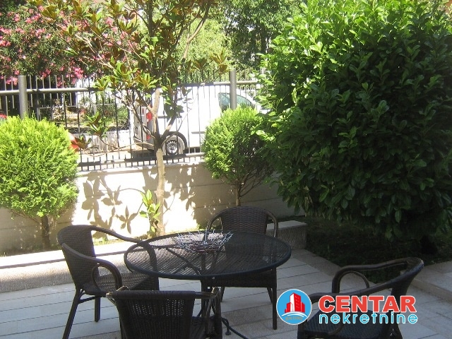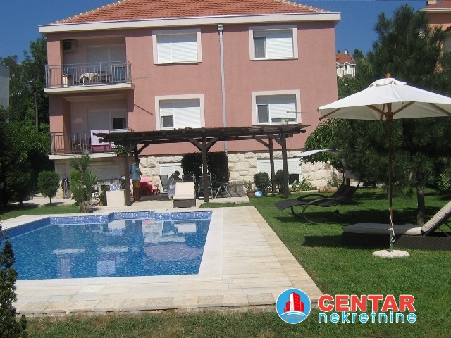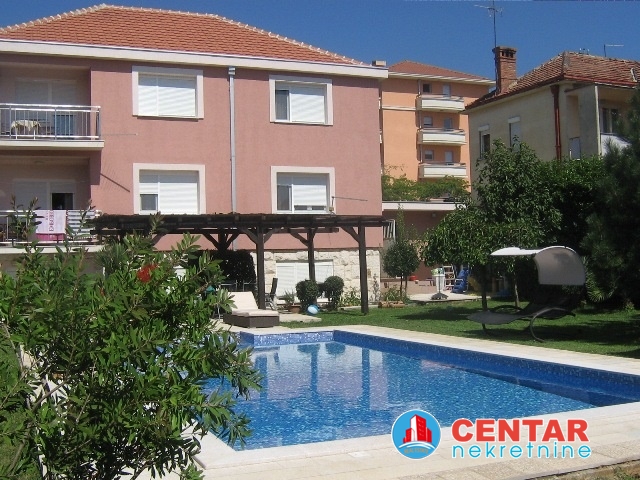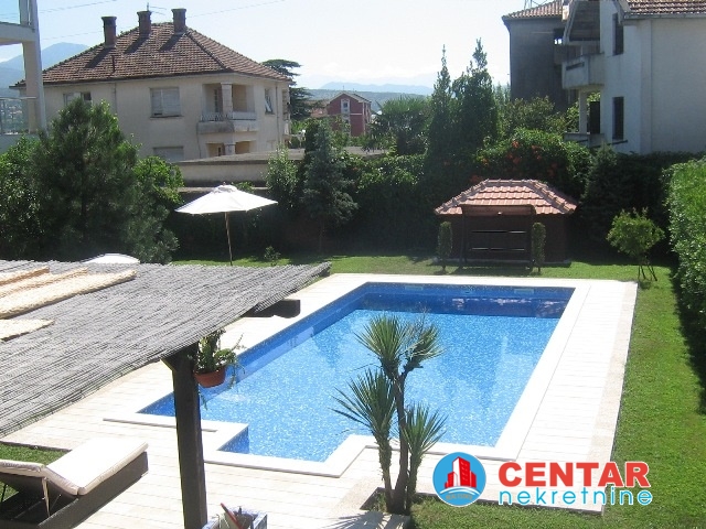 Kuca se sastoji od tri stana, na prvom nivou jednosoban stan, koji moze biti stan za poslugu ili igraonica za djecu. Na drugom i trecem nivou su komforni dvosobni stanovi. Kuca je u odlicnom stanju, renovirana prije godinu dana. Lijepo kultivisano dvoriste sa novim bazenom. Lijepo, moderno opremljeni stanovi. Cijena 4.500€