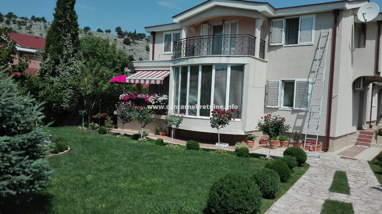 Komforna i moderna kuca za izdavanje, 330m2 na 1.200m2 kultivisanog placa. Kuca je na tri nivoa, posjeduje suterenski dio, koji je adaptiran u ljetnju kuhinju, prizemlje koje posjeduje veliki dnevni boravak, kuhinju, trpezariju, toalet, a na sledećem nivou su cetiri spavace sobe, kupatilo i terase. Instalirano je centralno grijanje i klima uređaji. Kuca se nalazi na odlicnoj lokaciji, uz rijeku Moracu, u Zagoricu.