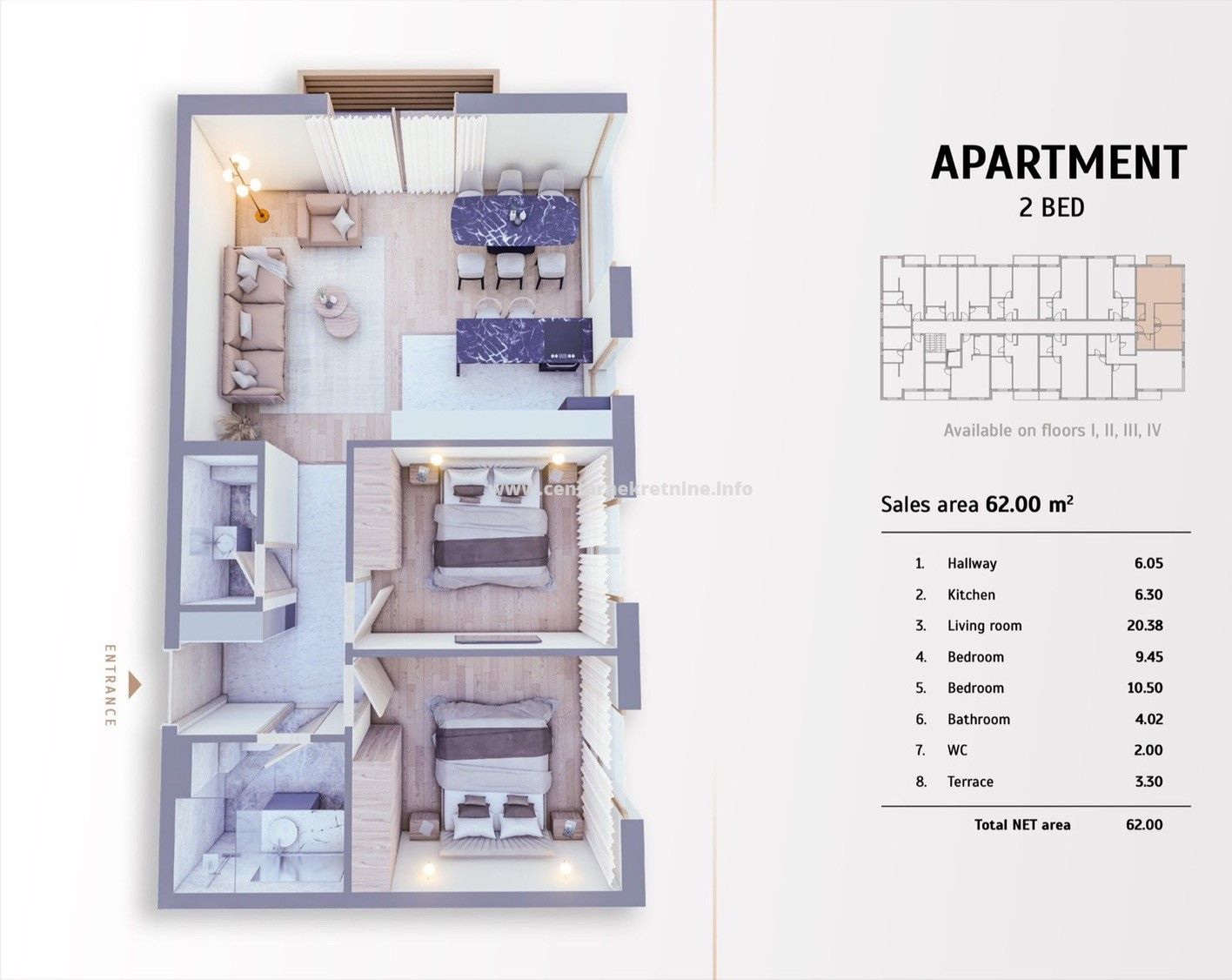 Prodaje se dvosoban stan u Kolasinu, povrsine 62m2, na II spratu. Stan se nalazi u zgradi koja je trenutno u izgradnji, rok izgradnje je jul 2024. godine. Stan se sastoji od hodnika, prostrane dnevne sobe sa trpezarijom i kuhinjom, 2 spavace sobe, kupatila, toaleta i terase. Postoji i mogucnost kupovine garaznog mjesta.