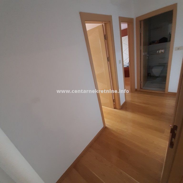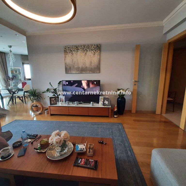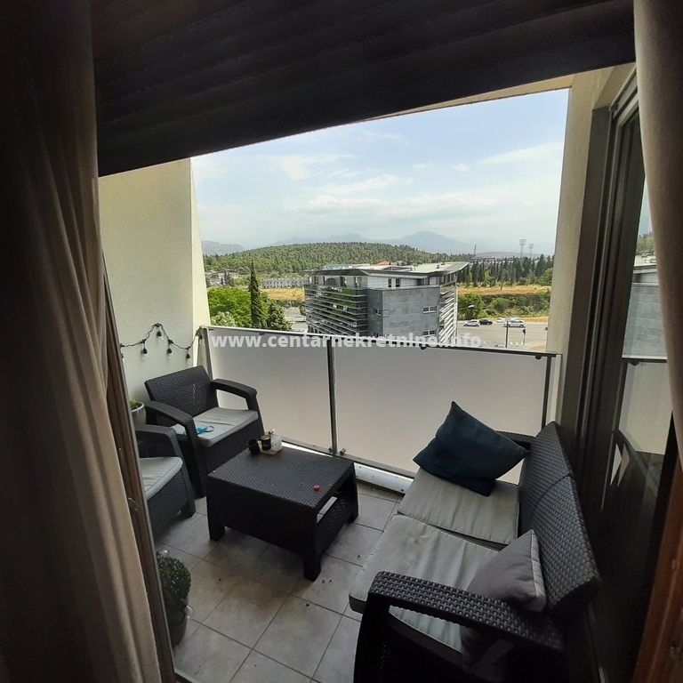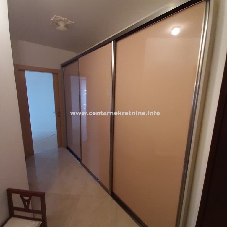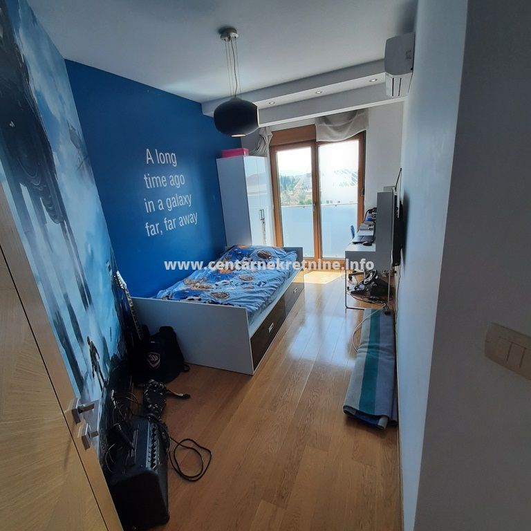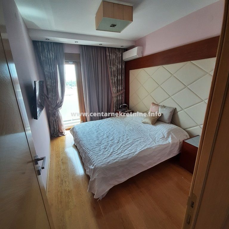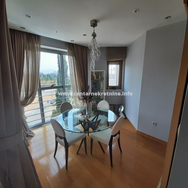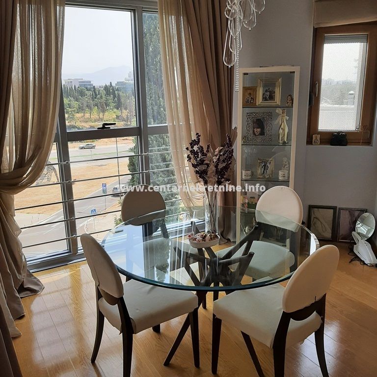 Izdaje se luksuzan, veoma lijepo namjesten trosoban stan na jednoj od najboljih lokacija, u zgradi Zetagradnje kod PC PC Palada. Stan je povrsine 103m2, nalazi se na IV spratu i ima garazno mjesto. Orijentisan je istocno. Stan se sastoji od prostrane dnevne sobe koja ima izlaz na veliku terasu sa lijepim pogledom, trpezarije, kuhinje, velikog hodnika sa plakarima, 3 spavace sobe, 2 manje terase, 2 kupatila i toaleta.