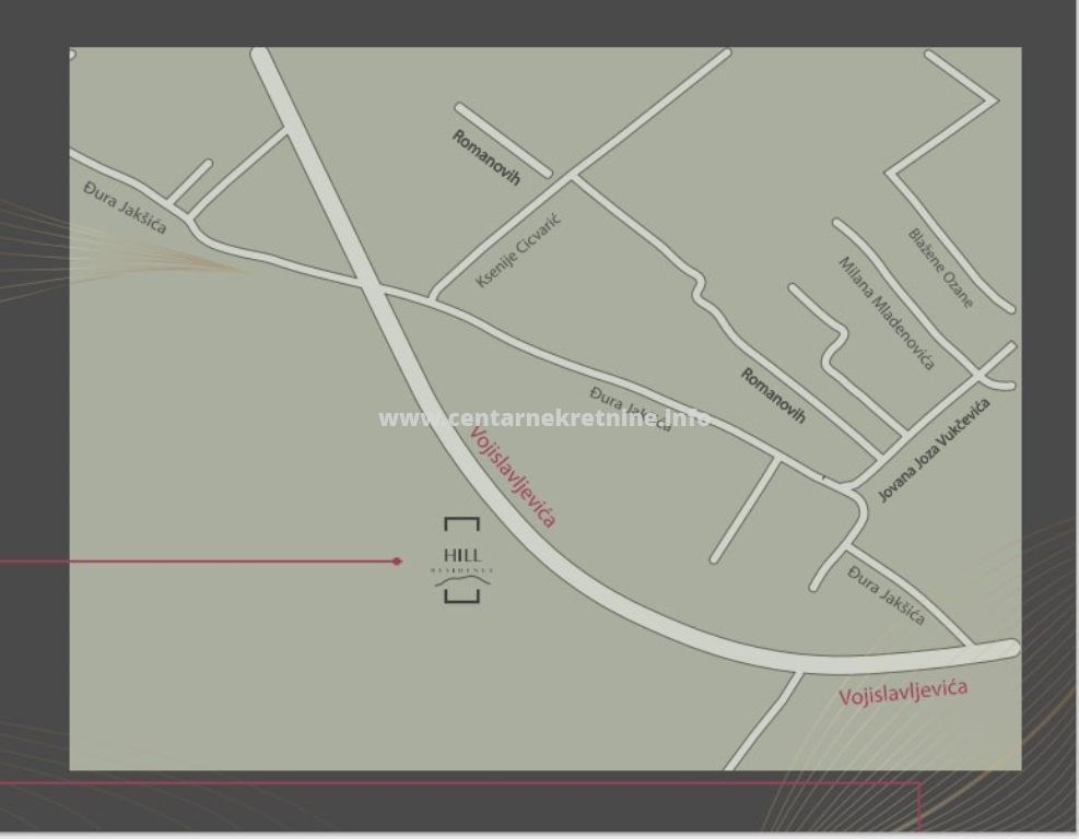 Na prodaju dvosobni stanovi 51m2, na svim spratovima,sa parking mjestom, u novom stambenom bloku Hill Residence, na Zabjelu, ulica Vojislavljevića, pored Cerova.Zgrada je u izgradnji do oktobra 2025. Ima četiri nivoa -prizemlje i tri sprata. Posjeduje lift.