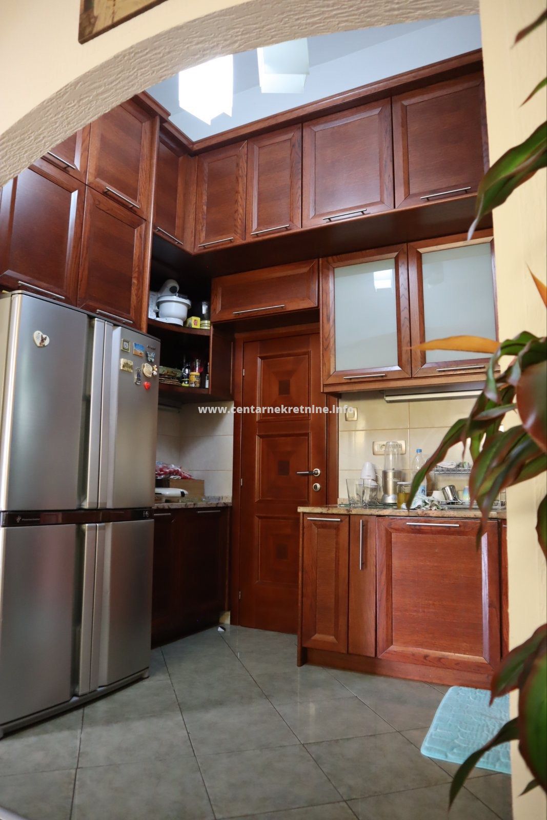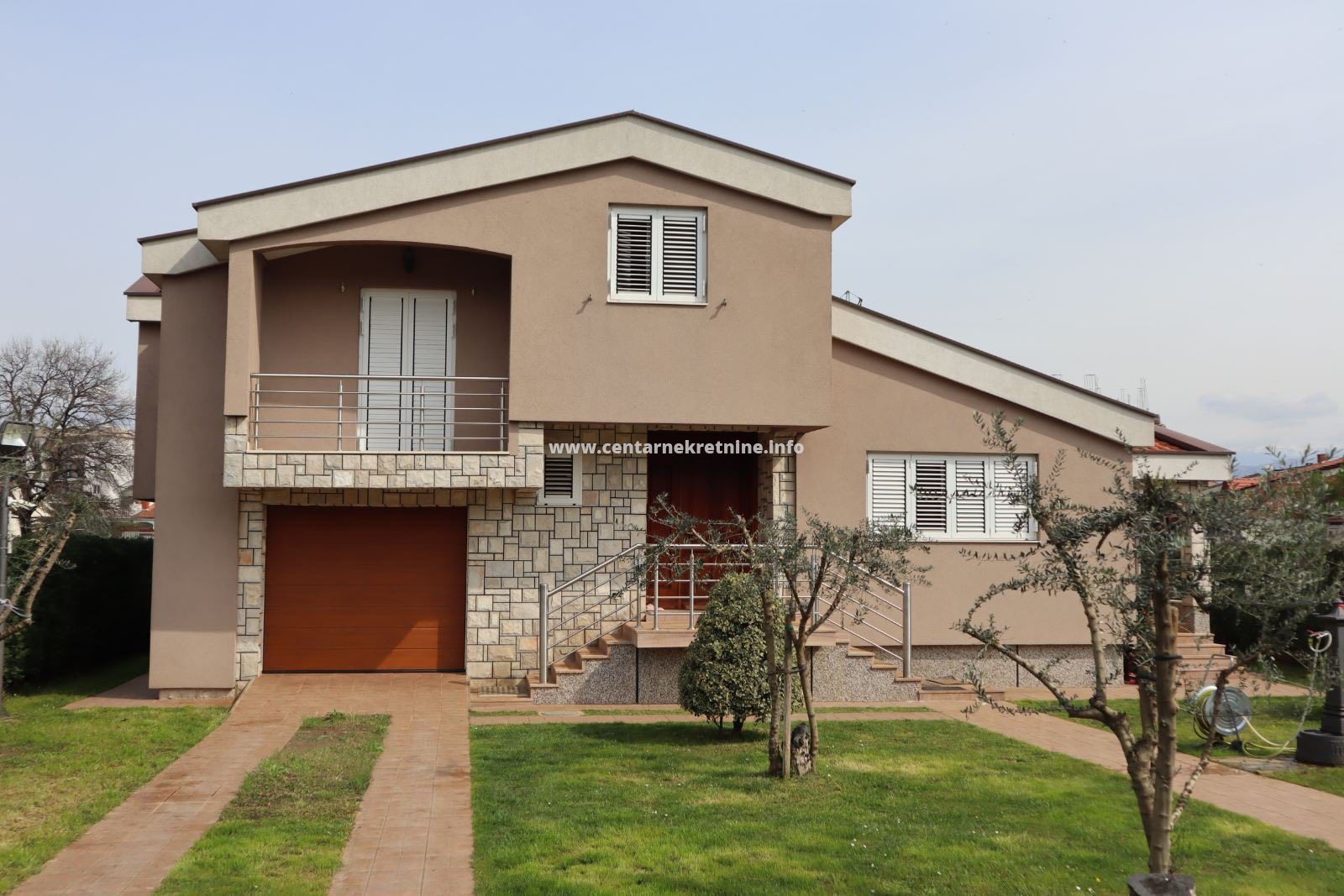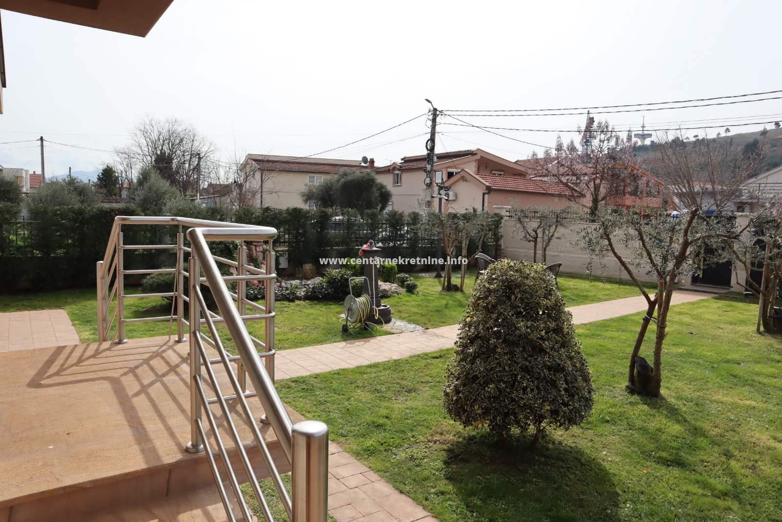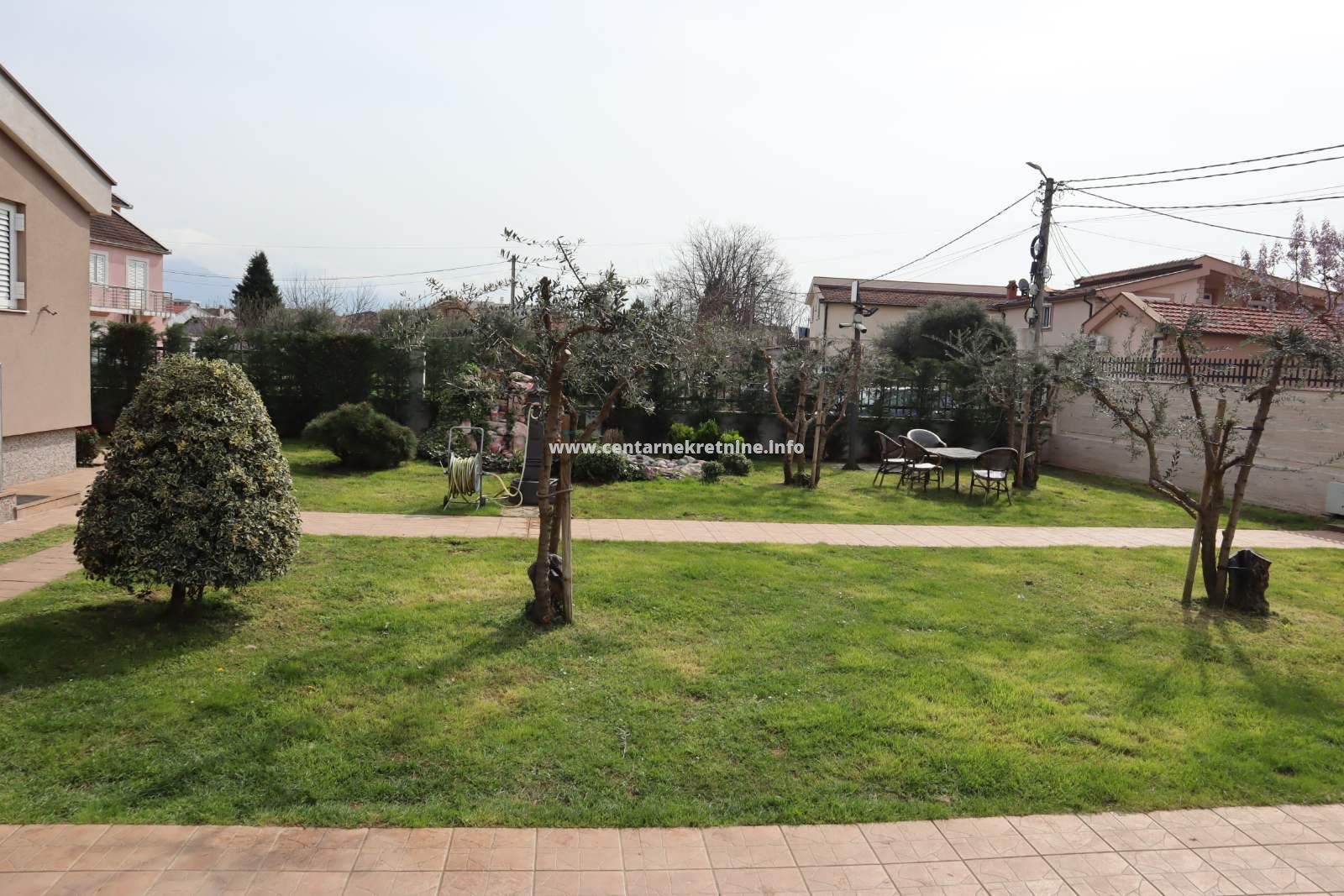 Prodaje se odlicna, prostrana kuca na Zabjelu, nedaleko od Glosarija. Kuca je povrsine 200m2 i nalazi se na lijepom, uređenom placu od 600m2. Građena je kaskadno, na 4 nivoa. Na prvom nivou nalazi se garaza i 1 soba, na drugom nivou je dnevna soba, trpezarija, kuhinja, ostava, vesernica, hodnik, cipelar, toalet i terasa, na trecem nivou su 2 sobe, kupatilo i 2 terase, dok su na cetvrtom nivou 2 sobe, kupatilo i ostava. Kuca je građena od najkvalitetnijih materijala, ima bezicni alarm sistem i video nadzor, ograđena je sa tri strane punim armiranim betonom i sa prednje strane aluminijumom i travertino kamenom. Ima zasad oko 100 ogradnih borova, kao i 7 starih maslina u dvoristu.