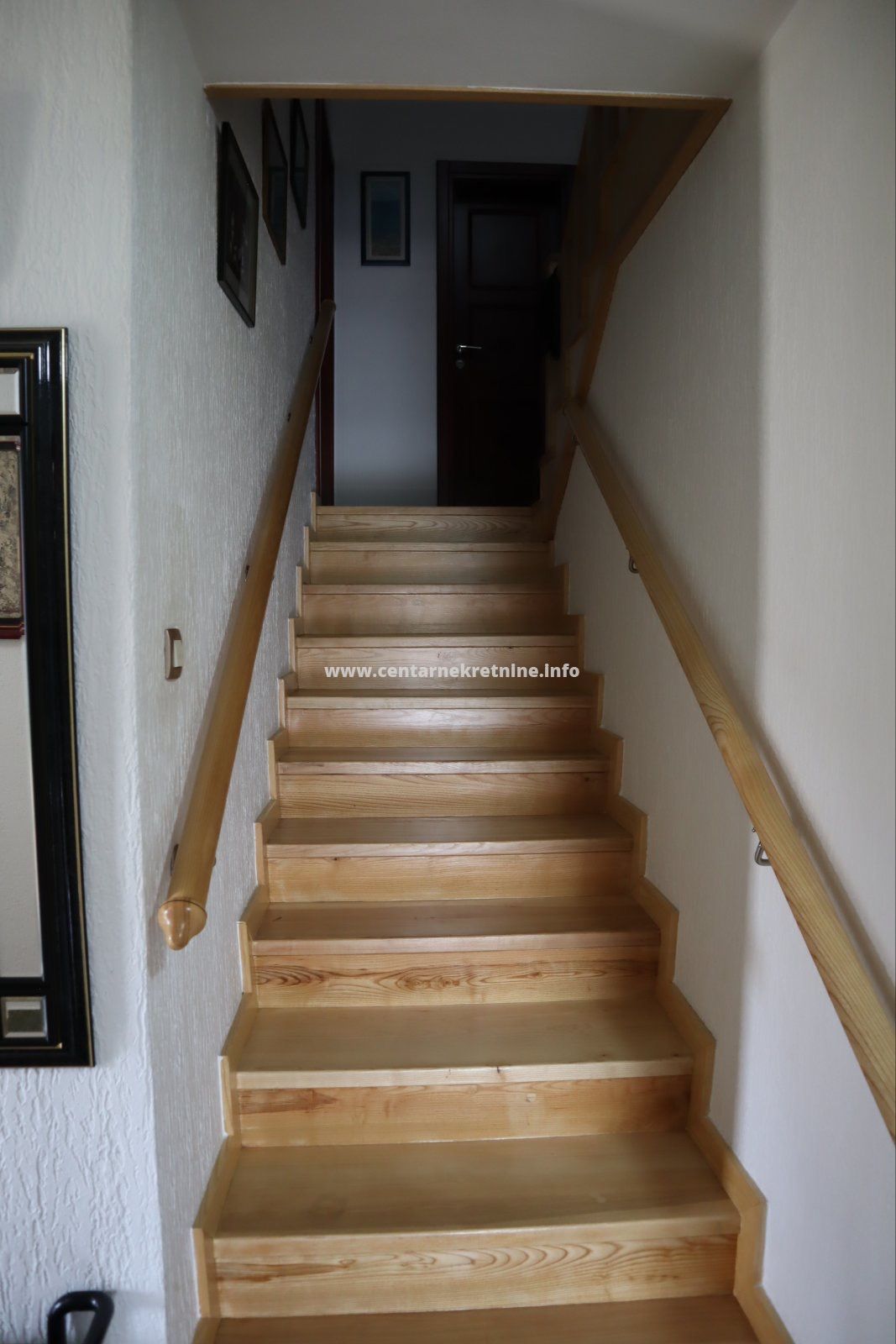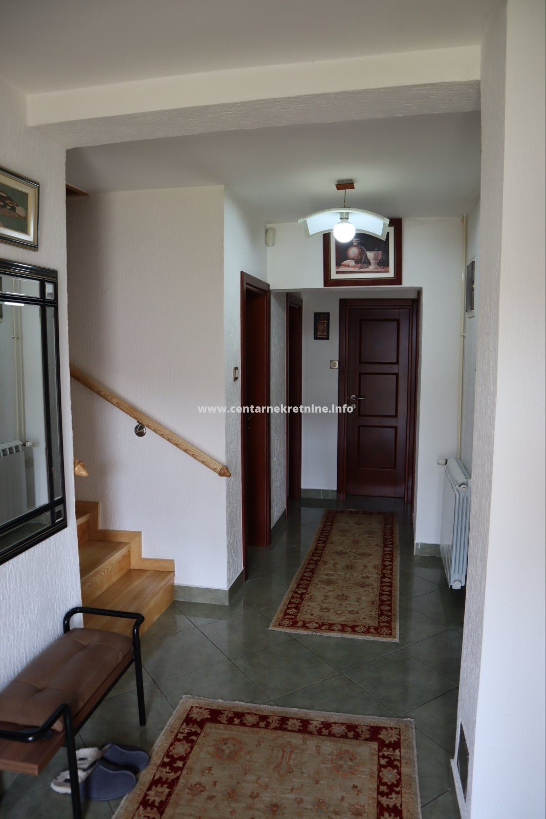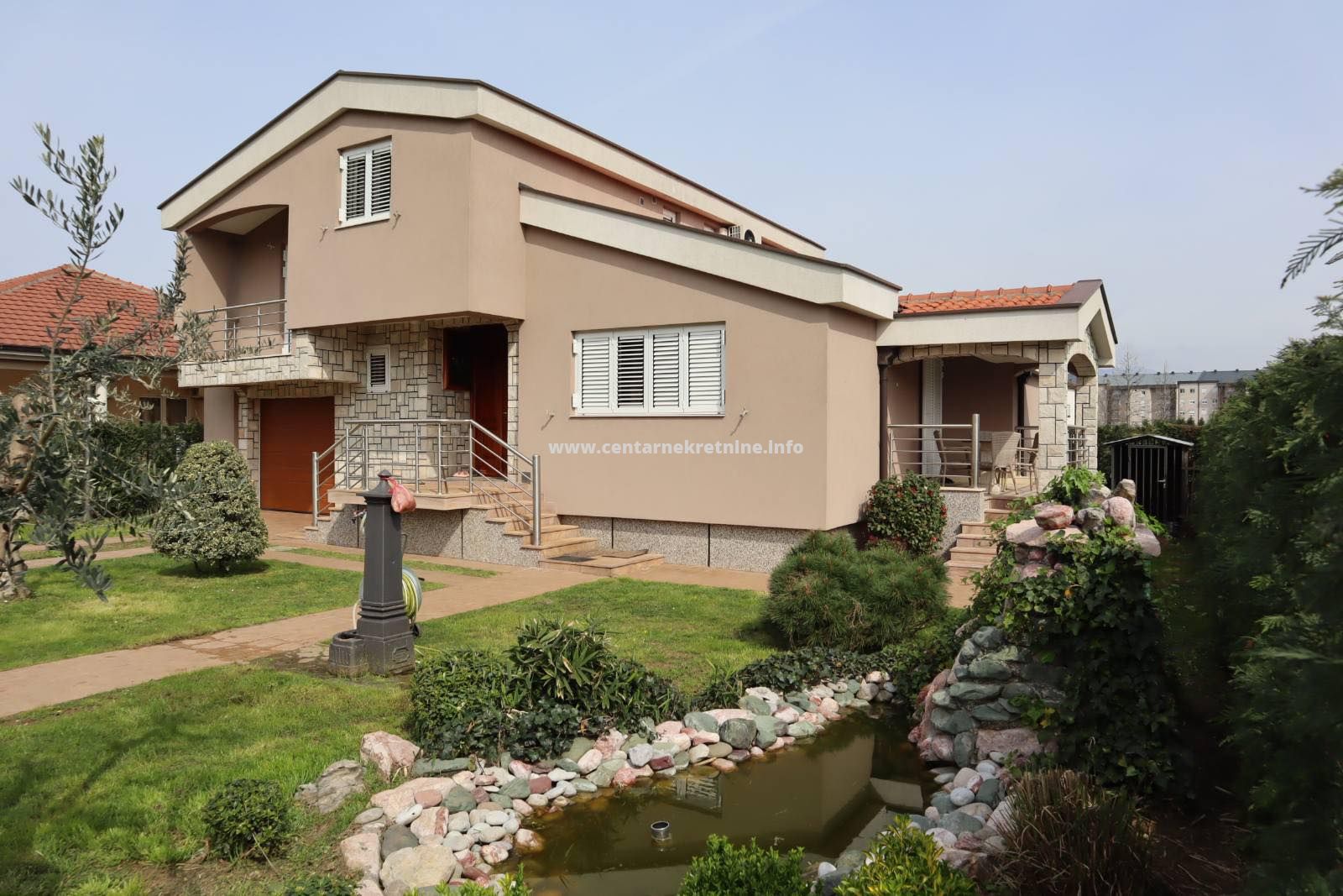Prodaje se odlicna, prostrana kuca na Zabjelu, nedaleko od Glosarija. Kuca je povrsine 200m2 i nalazi se na lijepom, uređenom placu od 600m2. Građena je kaskadno, na 4 nivoa. Na prvom nivou nalazi se garaza i 1 soba, na drugom nivou je dnevna soba, trpezarija, kuhinja, ostava, vesernica, hodnik, cipelar, toalet i terasa, na trecem nivou su 2 sobe, kupatilo i 2 terase, dok su na cetvrtom nivou 2 sobe, kupatilo i ostava. Kuca je građena od najkvalitetnijih materijala, ima bezicni alarm sistem i video nadzor, ograđena je sa tri strane punim armiranim betonom i sa prednje strane aluminijumom i travertino kamenom. Ima zasad oko 100 ogradnih borova, kao i 7 starih maslina u dvoristu.