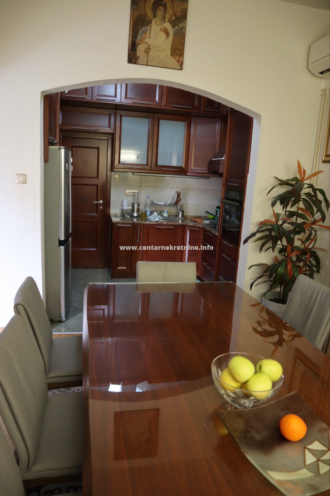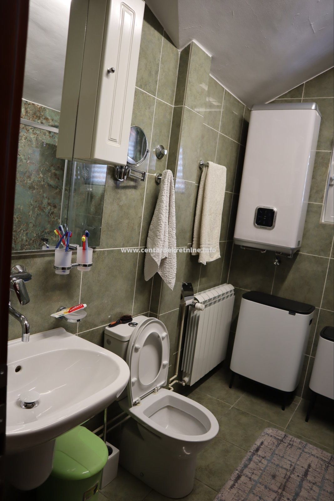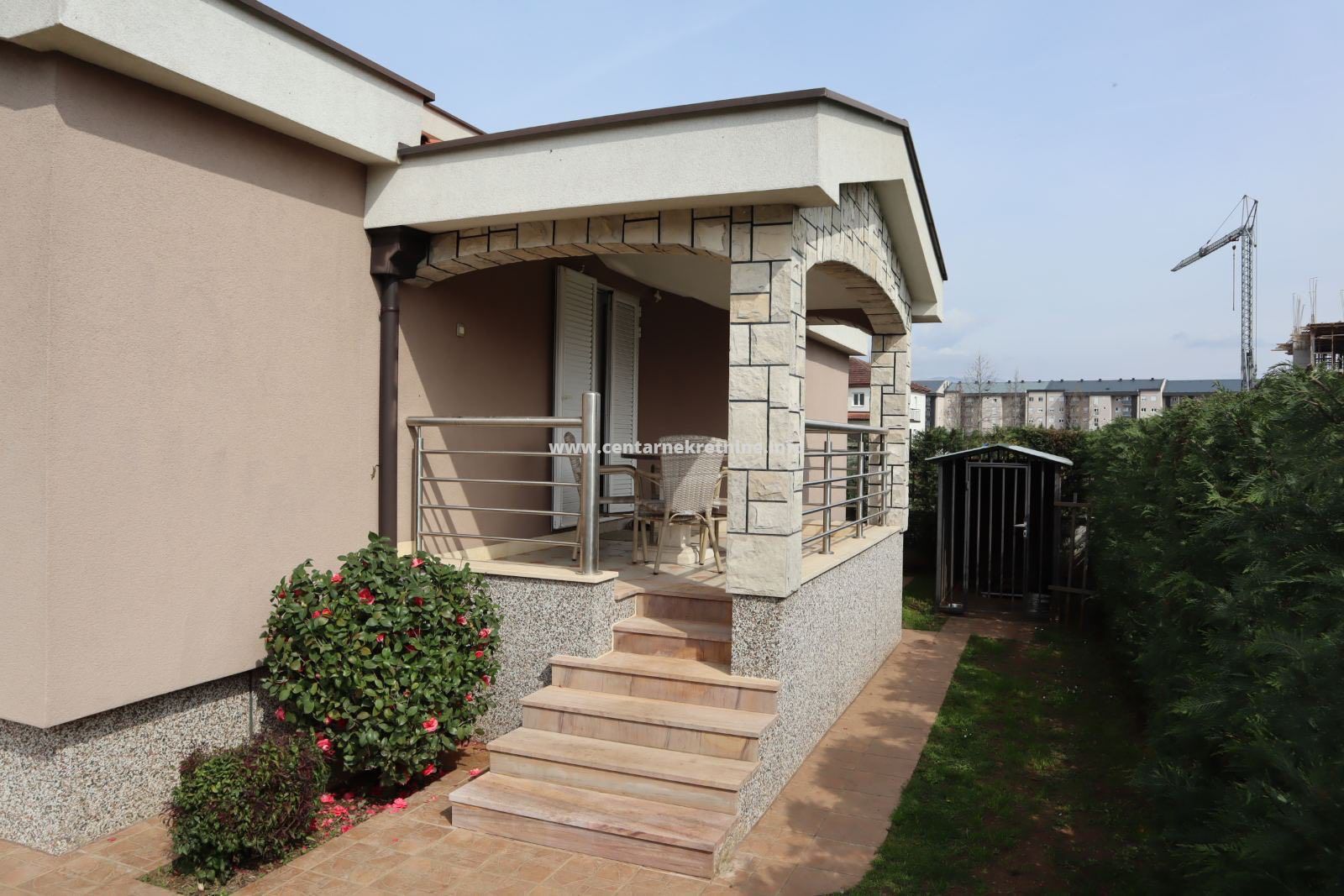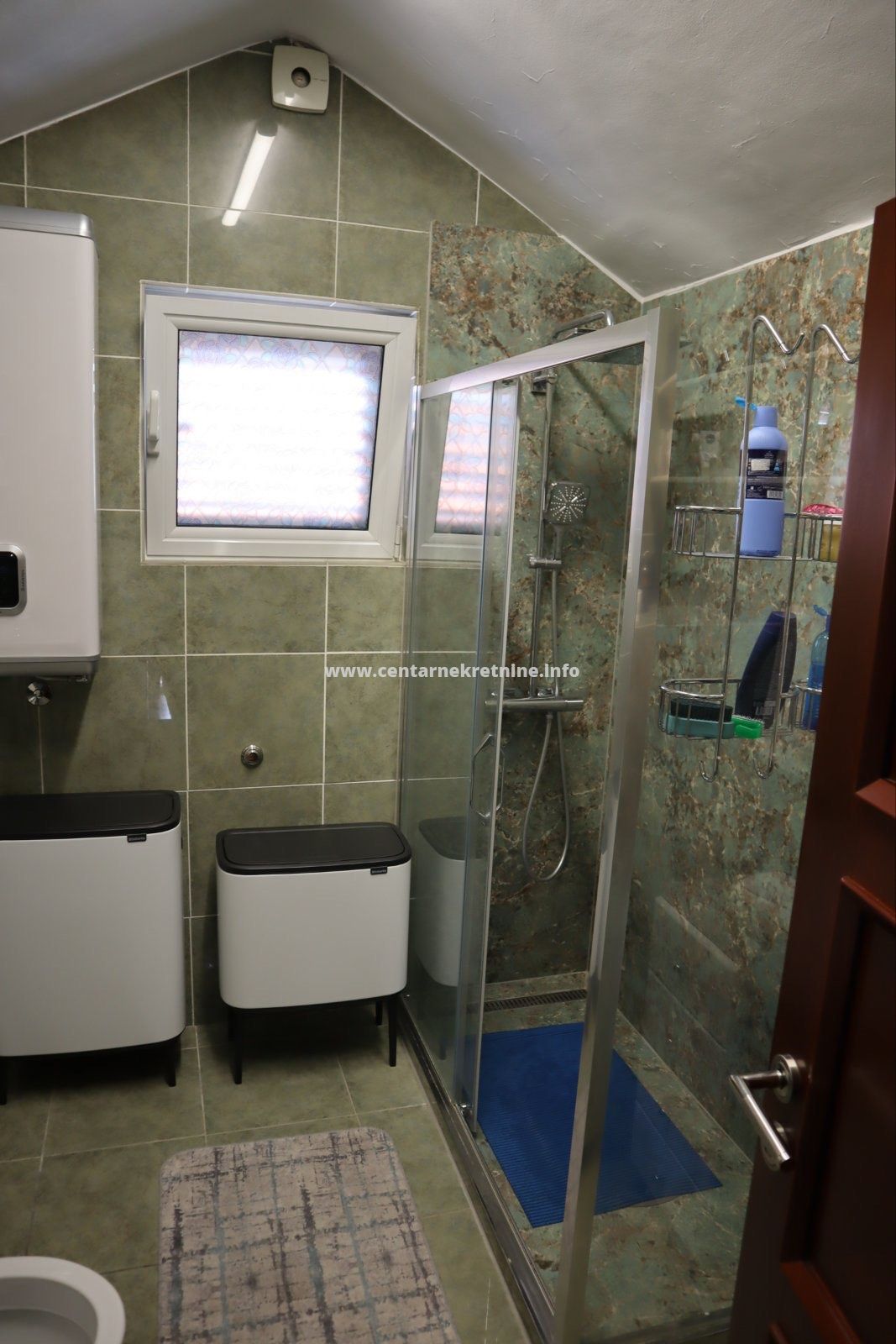 Prodaje se odlicna, prostrana kuca na Zabjelu, nedaleko od Glosarija. Kuca je povrsine 200m2 i nalazi se na lijepom, uređenom placu od 600m2. Građena je kaskadno, na 4 nivoa. Na prvom nivou nalazi se garaza i 1 soba, na drugom nivou je dnevna soba, trpezarija, kuhinja, ostava, vesernica, hodnik, cipelar, toalet i terasa, na trecem nivou su 2 sobe, kupatilo i 2 terase, dok su na cetvrtom nivou 2 sobe, kupatilo i ostava. Kuca je građena od najkvalitetnijih materijala, ima bezicni alarm sistem i video nadzor, ograđena je sa tri strane punim armiranim betonom i sa prednje strane aluminijumom i travertino kamenom. Ima zasad oko 100 ogradnih borova, kao i 7 starih maslina u dvoristu.