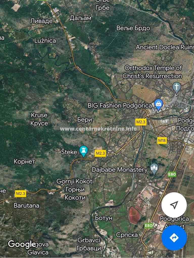ID - 6119Na prodaju imanje 8.831m2 , Šteke nadomak Podgorice, 100m udaljeno od magistralnog puta Podgorica-Cetinje, 500m od Renault servisa.Dozvoljena izgradnja montažno-demontažnih objekata.