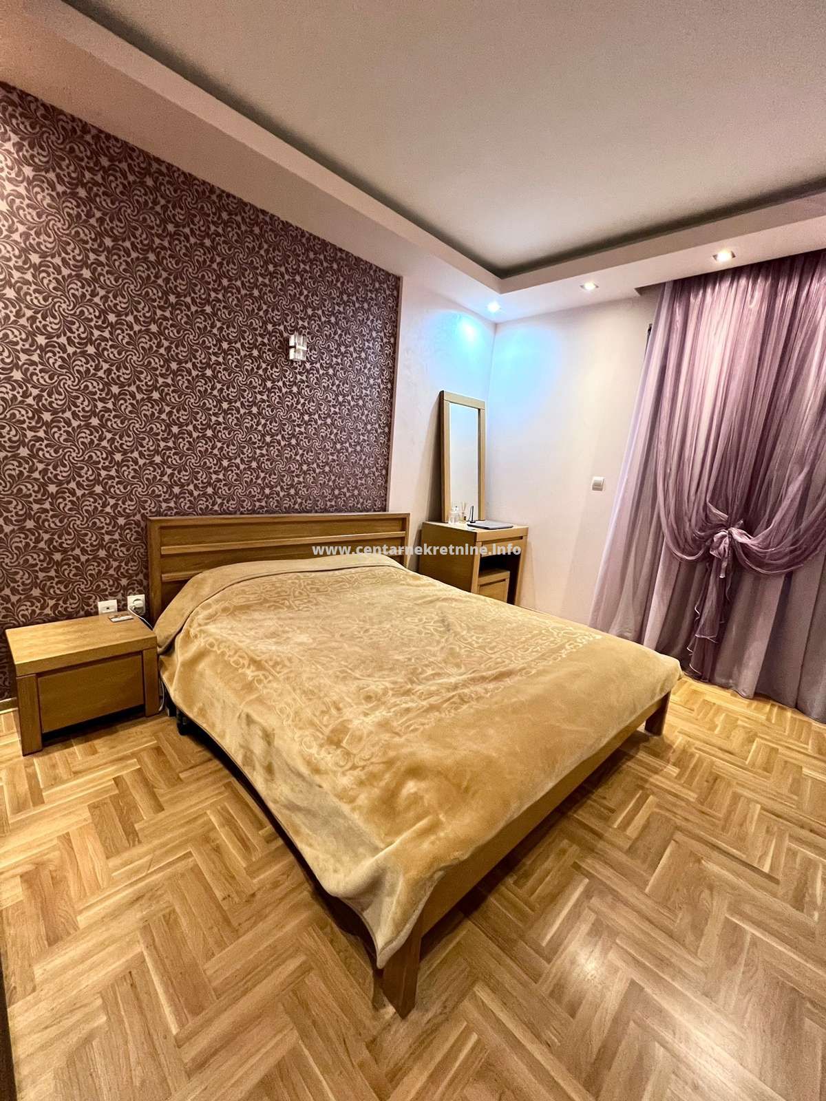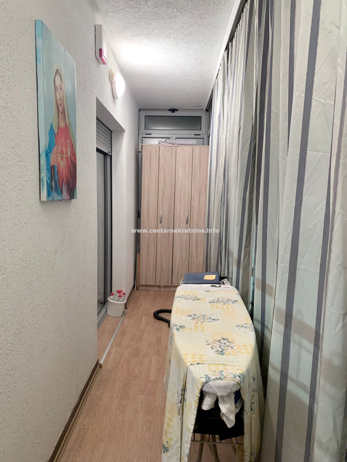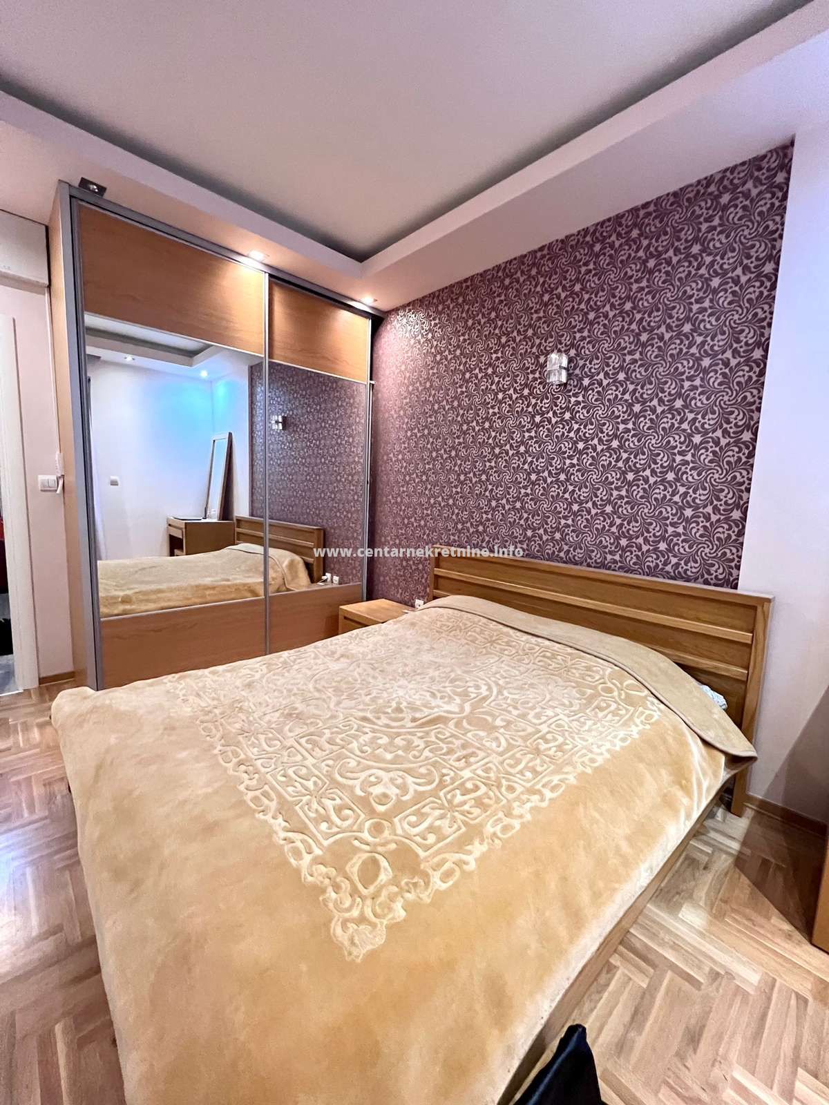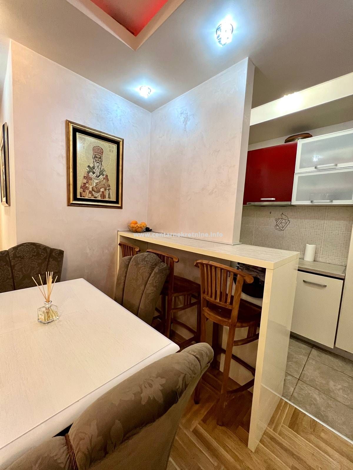 ID - 6129Izdaje se luksuzan, kompletno namjesten jednosoban stan u mjestu Lazi u Budvi, iznad Parme. Stan je povrsine 56m2, nalazi se na I spratu. Sastoji se od hodnika, dnevne sobe sa trpezarijom, kuhinje, spavace sobe, kupatila i terase.