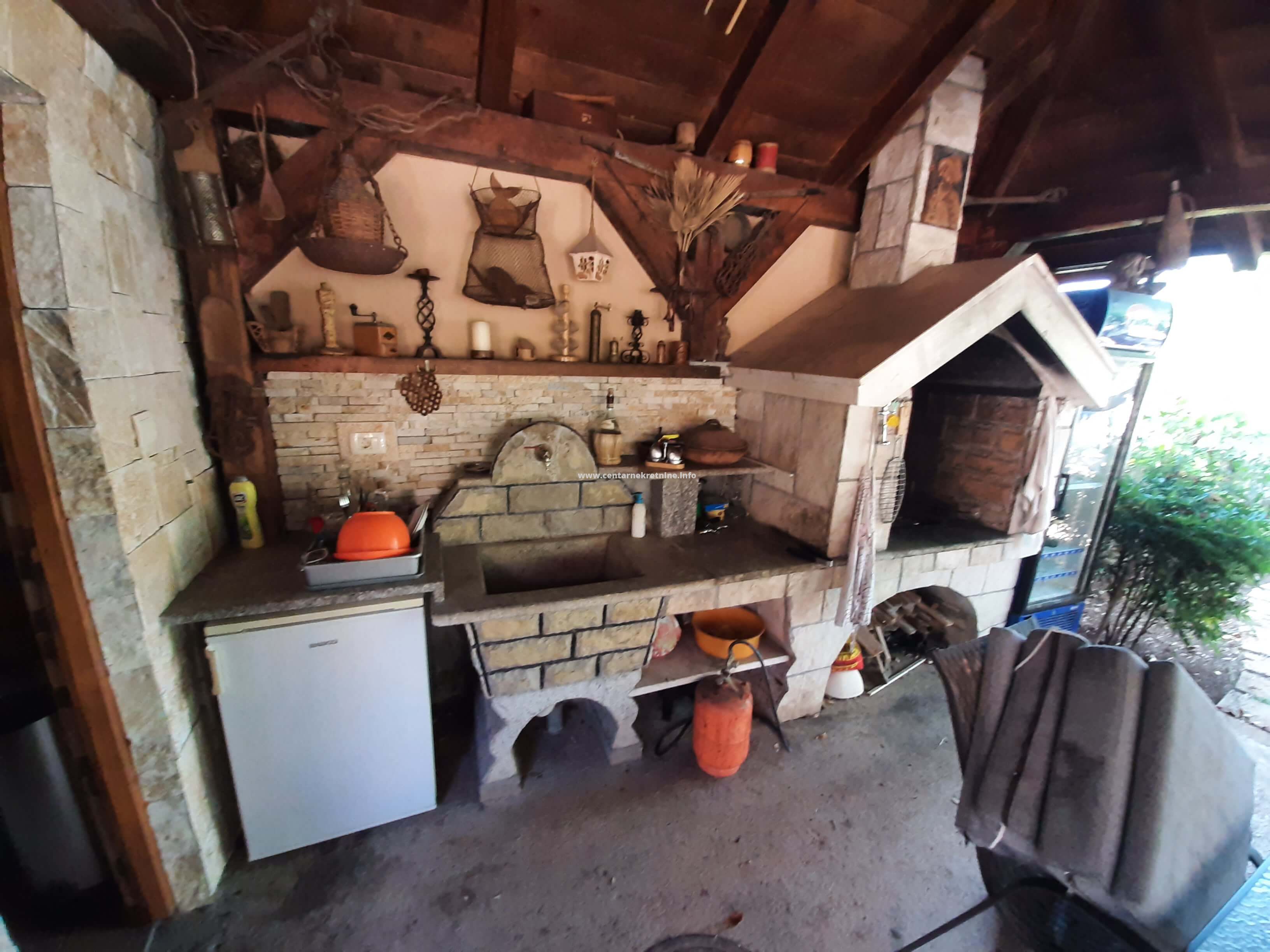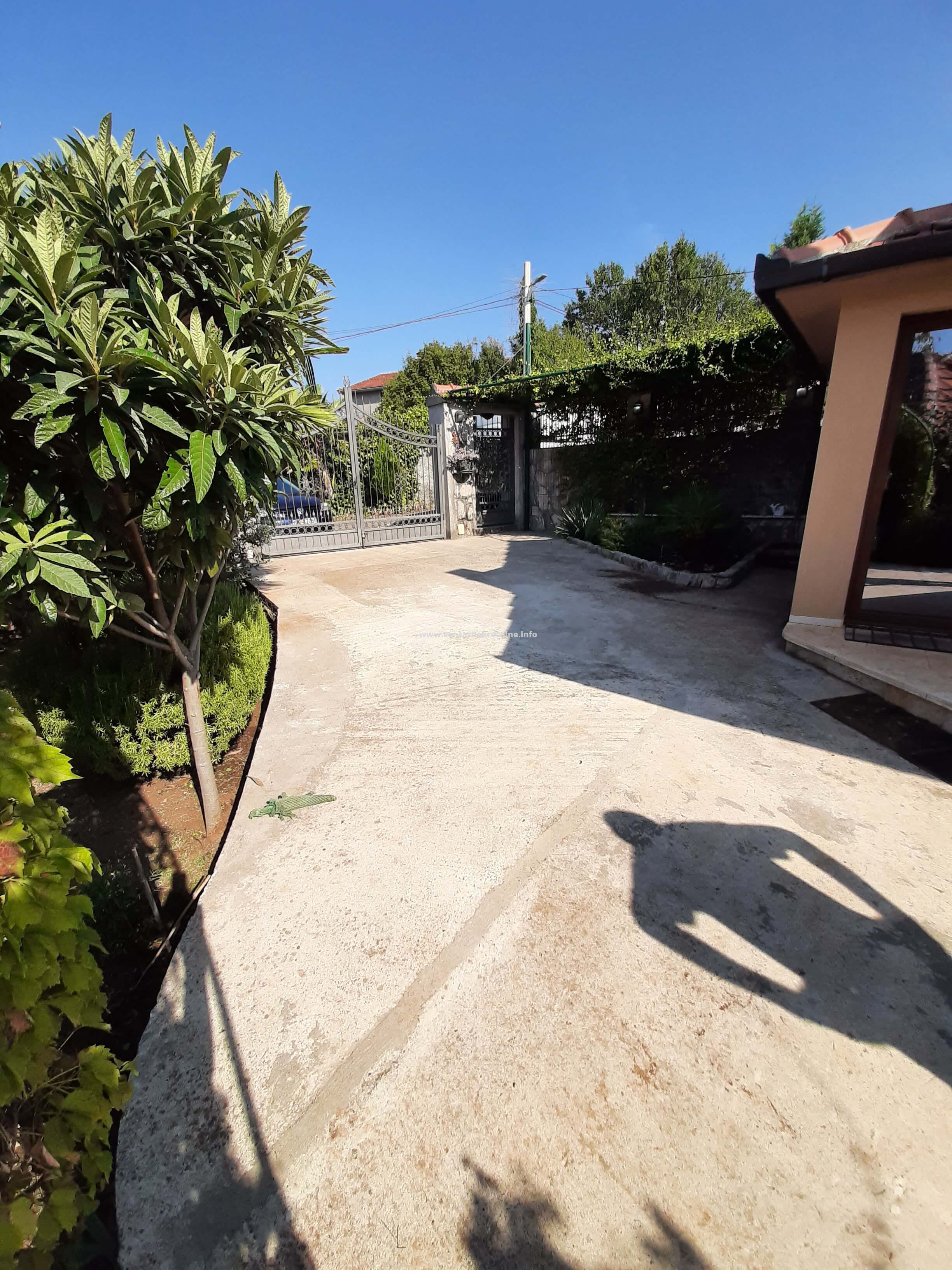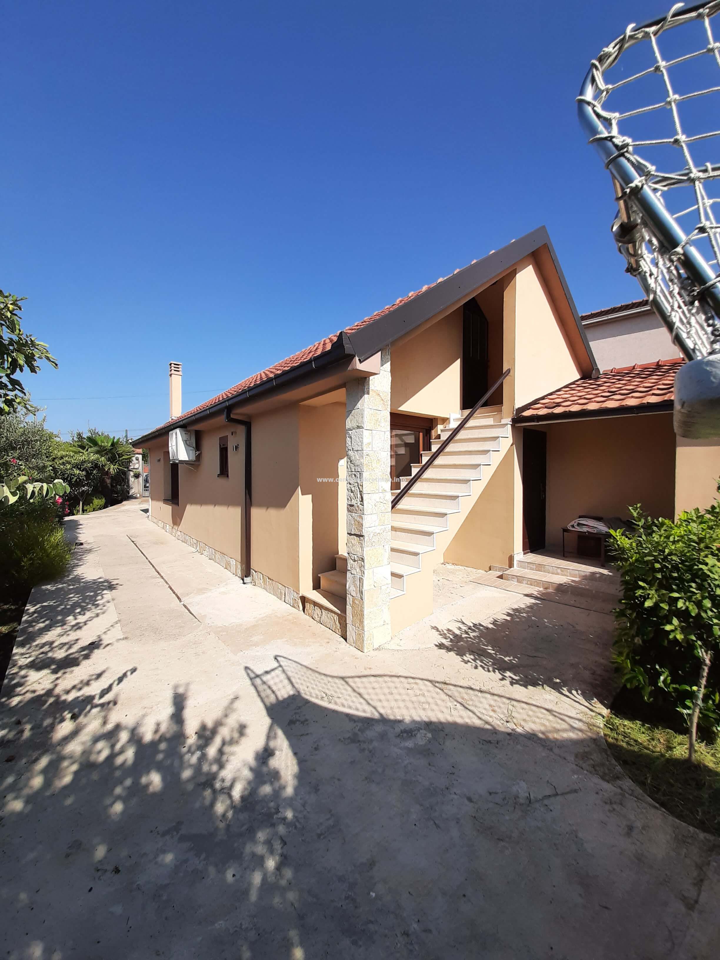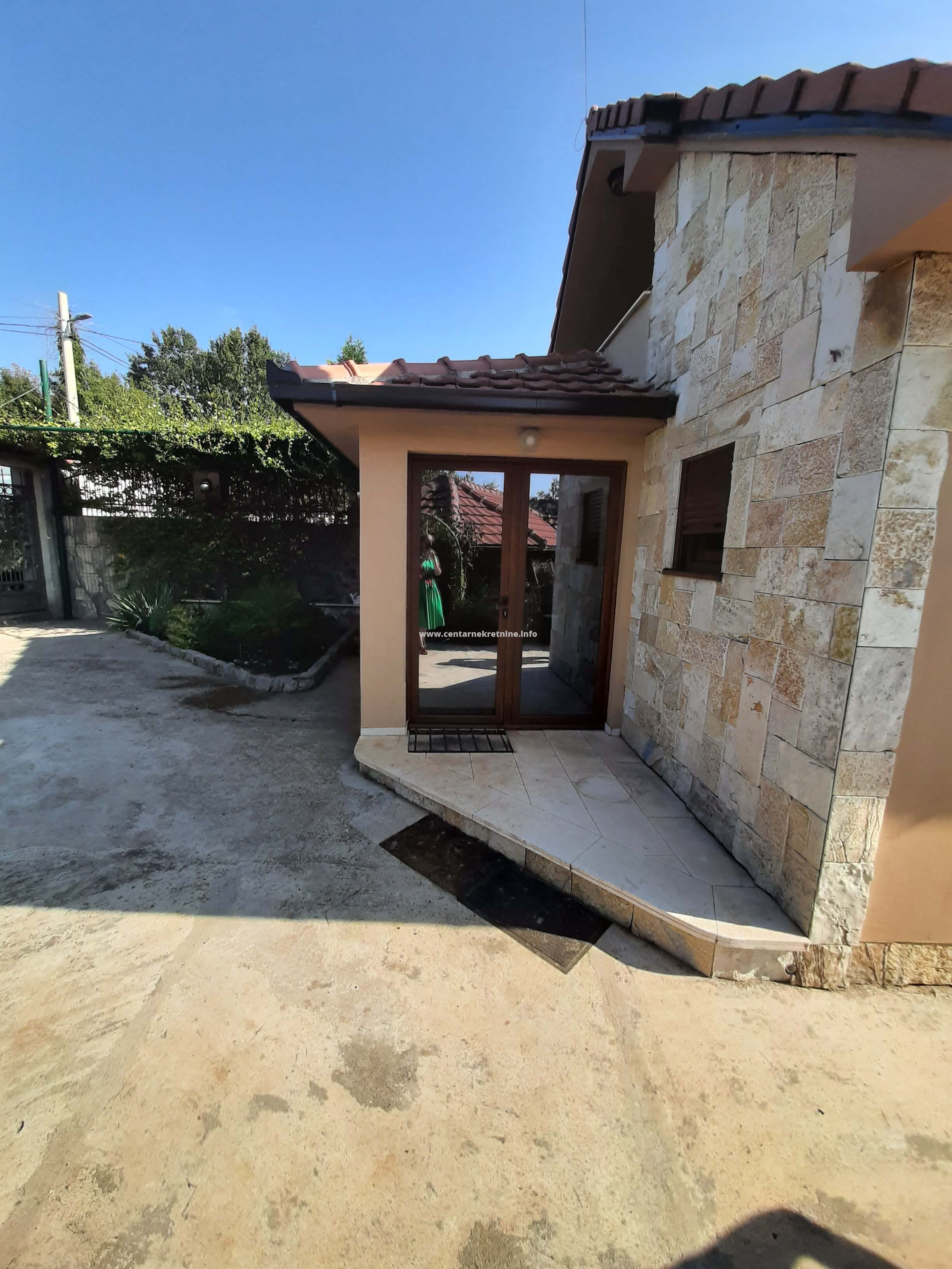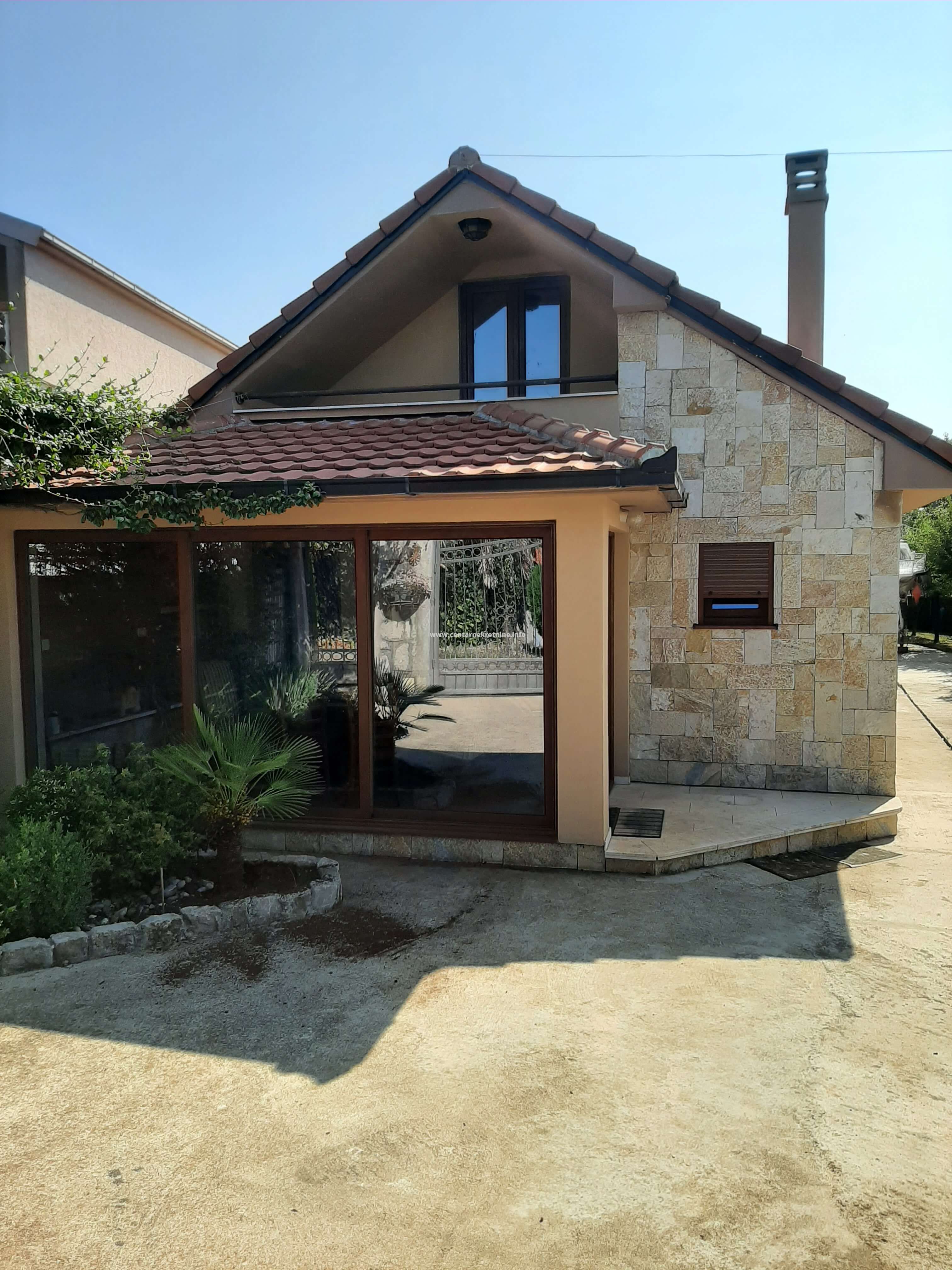 Izdaje se kuca u mjestu Mareza, povrsine 100m2, na placu od 940m2, ograđenim visokim kamenim zidom i kovanom ogradom. Plac je kultivisan, zasađen raznivrsnim biljkama, vockama, ukrasnim i dekorativnim biljkama i cvijecem. Kuca posjeduje veliki hodnik u obliku staklene terase, dnevniboravak, kuhinju, trpezariju, veseraj, ostavu, spavacu sobu sa francuskim lezajem i dva odvojena garderobera i kupatilom. U sklopu kuce nalazi se i soba sa kupatilom sa zasebnim ulazom. Na placu se nalazi djelimicno zastakljeni ljetnjikovac sa kuhinjom i taoletom velicine 34m2. U produzetku kuce je ostava/teretana 40m2. Ispred kapije parking za 2 vozila. Kuca je opremjena inverteskim klima uredjajem i gusanom kamin peci na drva. U uglu placa je izgrađen box za kucne ljubimce sa nadstresnicom.